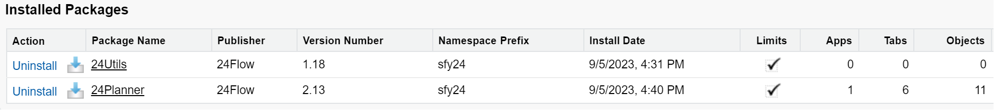 Once both package are installed, navigate to Setup > Installed Packages you can see the packages that are installed on your org. After the installation, both 24Utils and 24Planning will be available.