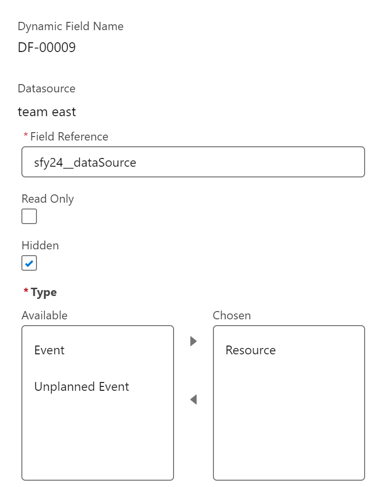 Type: select whether this dynamic field should be shown for planned events, unplanned events or for the resource (in the left pane).